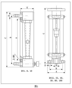 LZB/LZB-( )F流量計的錐管為光滑內(nèi)壁管(見圖4),通徑DN15以上的流量計,浮子通過導(dǎo)桿 上下移動,保持穩(wěn)定;LZJ/LZJ-( )F流量計錐管 內(nèi)壁有三條導(dǎo)向凸筋,使浮子保持穩(wěn)定(見圖4)。通徑DN10以下的流量計采用軟管連接,配有 針形流量調(diào)節(jié)閥;通徑DN15以上流量計采用法蘭連接。